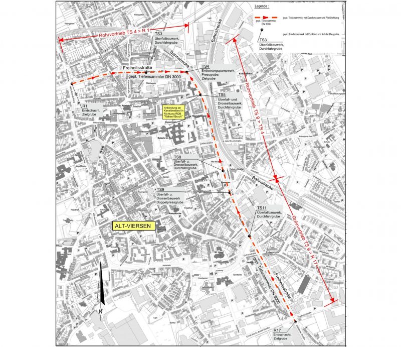Auf Grundlage des Generalentwässerungplans für die Stadt Viersen wird zum Schutz vor Überflutungen der Mischwasserkanalisation in Alt-Viersen ein Retentionsvolumen von 17.500 m³ geschaffen. Da für konventionelle Becken kein Platz vorhanden ist, wird ein Staukanal DN 3000 in ca. 10 – 12 m Tiefe vorgetrieben. Damit liegt der Kanal unterhalb des Gefährdungsbandes eventueller Kampfmittel. Der Kanal wird aus einer Startgrube aus 1.750 m in Richtungen Süden und 750 m in Richtung Westen vorgetrieben. Diese Startgrube wird anschließend zum Entleerungsschacht mit einem Pumpwerk ausgebaut. Die vorhandene Kanalisation wird über große Fallschächte an den Tiefensammler angeschlossen. Die Fallhöhe für das Abwasser beträgt bis zu 8 m. Zur Energieumwandlung werden 3-stöckige Rinnenkaskaden in den Schacht eingebaut.