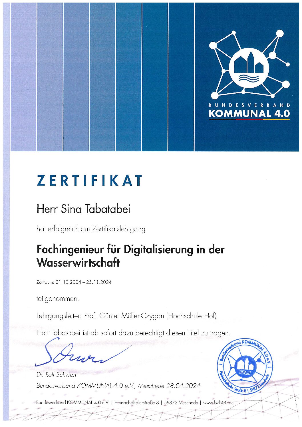 Herr Sina Tabatabaei hat den Zertifizierungslehrgang „Fachingenieur | Fachexperte für Digitalisierung in der Wasserwirtschaft“ erfolgreich absolviert. Das Programm umfasste insgesamt zwölf Teilmodule, einen Praxistag sowie eine abschließende Projektarbeit.